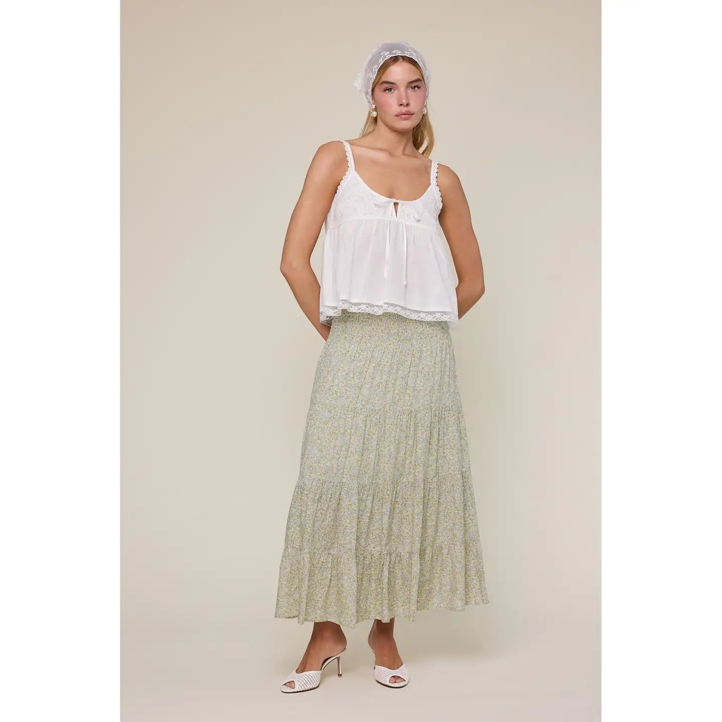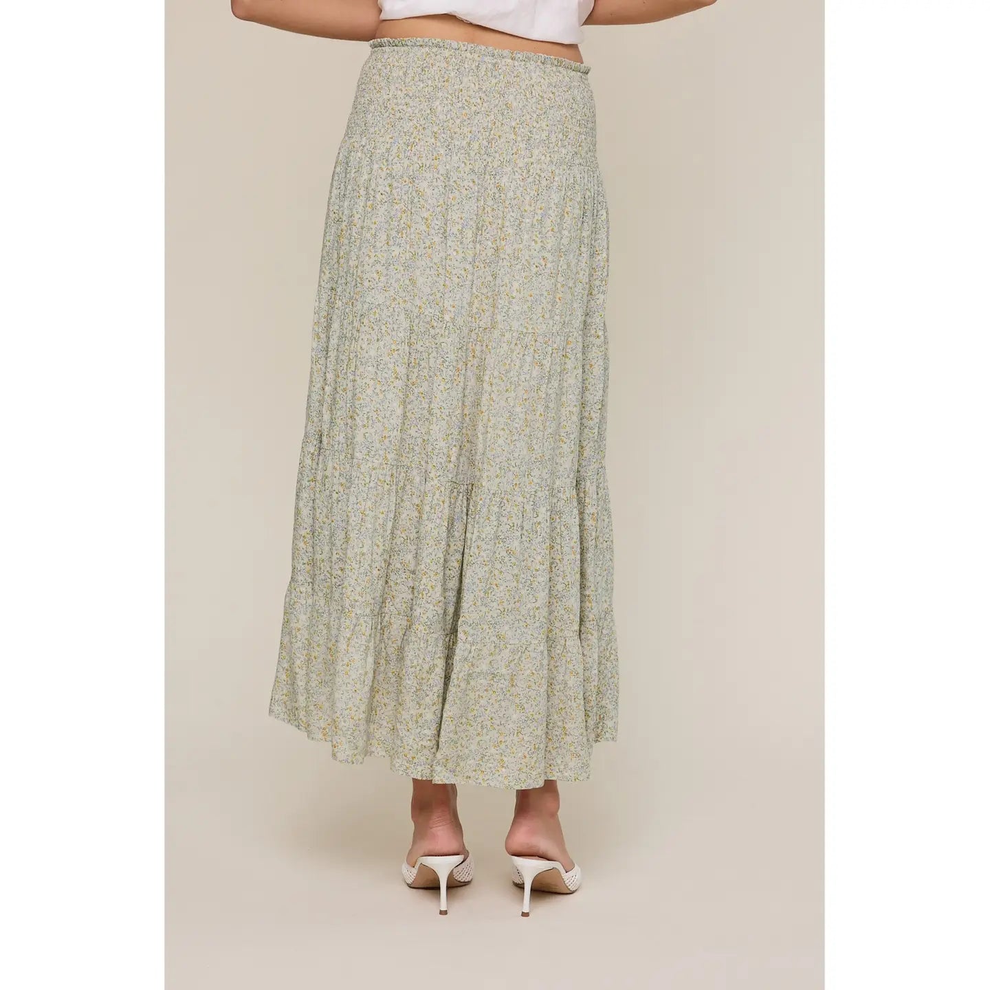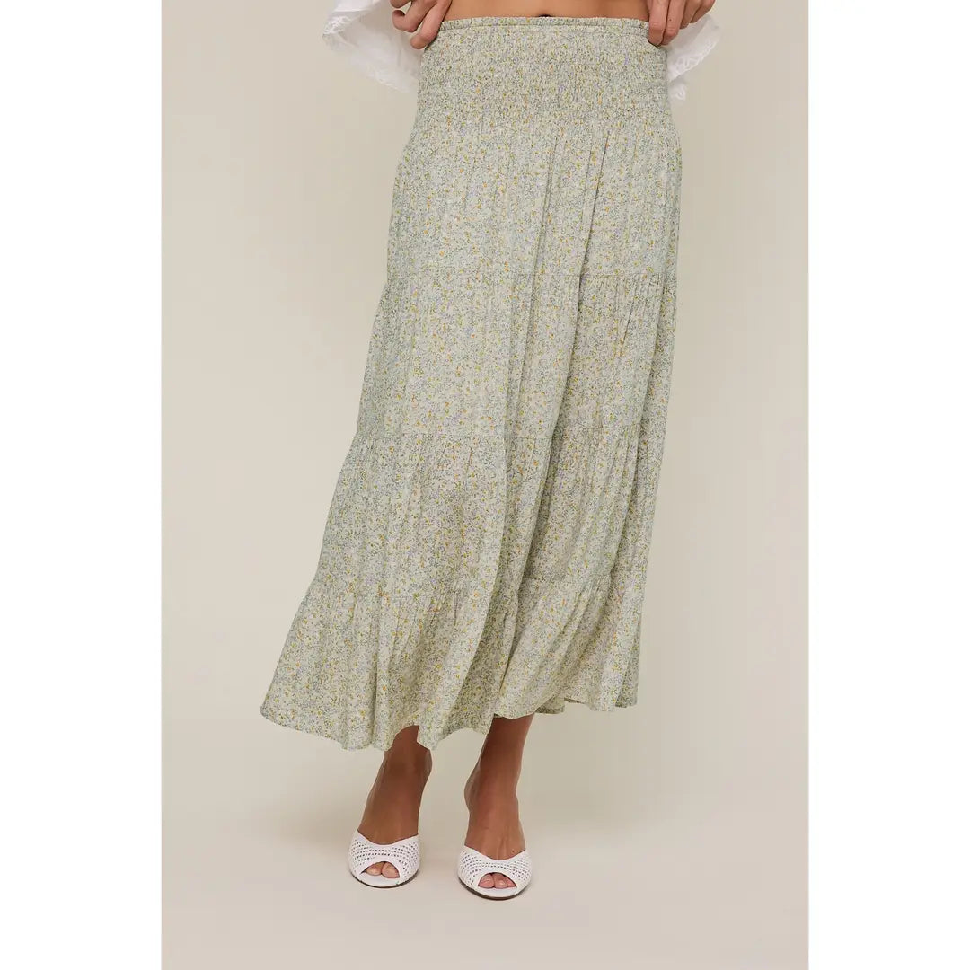 Embrace effortless elegance with the Meadow Muse Skirt, a tiered midi featuring a charming ditsy floral print that captures the essence of spring and summer style. The smocked waistband provides a comfortable, relaxed fit perfect for everyday wear, while the lined construction ensures a polished finish. Graceful tiers create beautiful movement, making this piece ideal for those seeking a feminine, breezy silhouette that transitions seamlessly from casual outings to leisurely days.