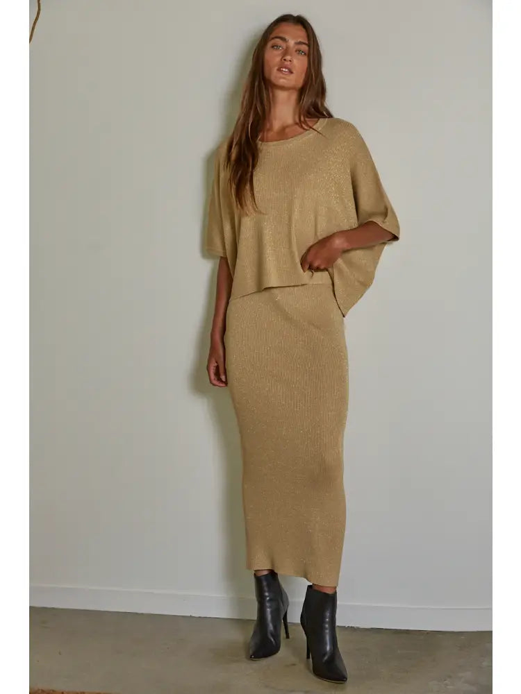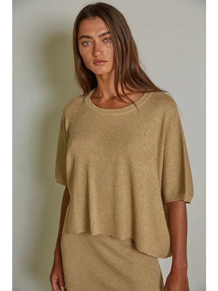 The Gilded Glow Top is your new go-to for effortless elegance. This knit sweater blends viscose, lurex, and nylon into a luxuriously soft ribbed fabric that catches the light beautifully. The round neckline and short sleeves make it perfect for layering or wearing solo, while the subtle shimmer adds just the right touch of glamour to any outfit. Versatile enough for casual days and polished enough for nights out.