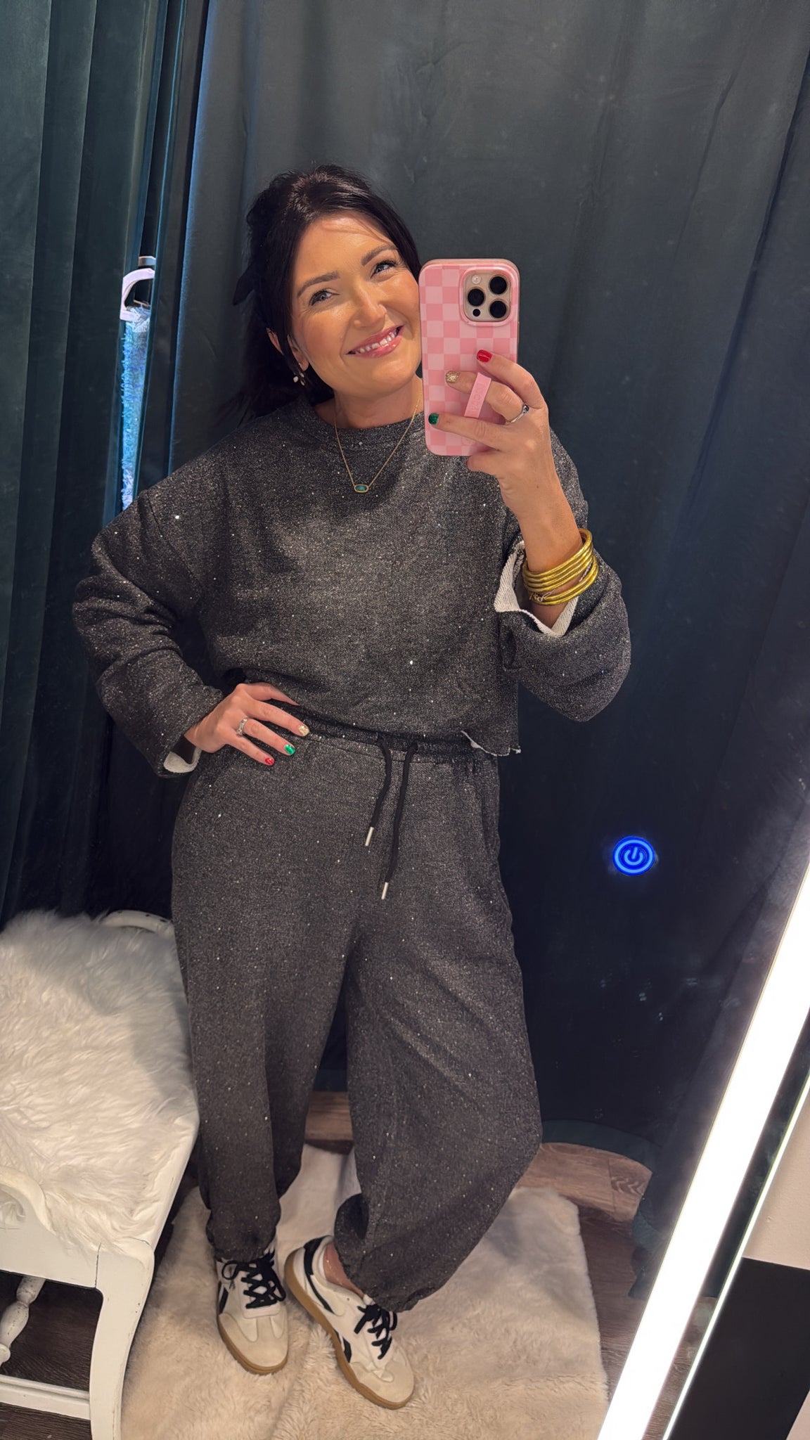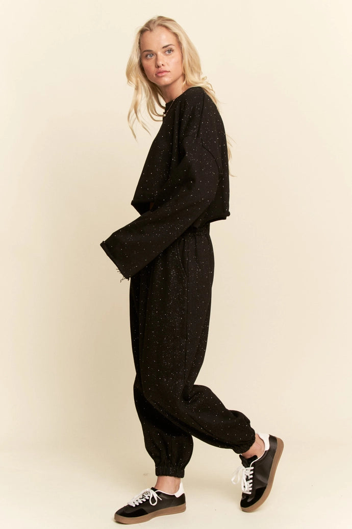 The Lindz Set is your ticket to looking effortlessly chic while feeling completely relaxed. This playful lounge duo pairs a cropped long sleeve top with relaxed joggers, both adorned with sparkly rhinestone accents that add just the right amount of glamour. Soft, stretchy, and oh-so-comfortable, it's perfect for lounging at home or running around town in style. Comfort never looked this good.