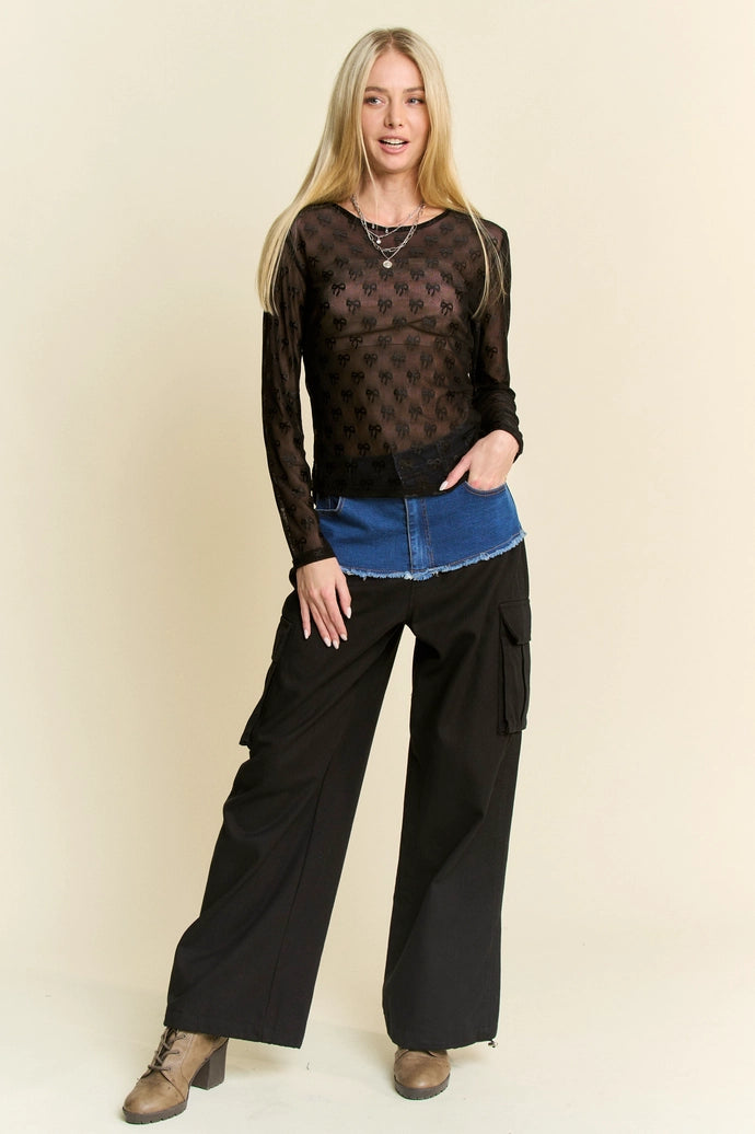 Elevate your layering game with this whimsical ribbon-embroidered sheer top. Delicate mesh fabric creates an airy, romantic silhouette, while intricate ribbon detailing adds a touch of vintage-inspired charm. The long sleeves offer versatile coverage, making it perfect for pairing over basics or wearing solo for an effortlessly chic look. A playful piece that transforms any outfit into something special.