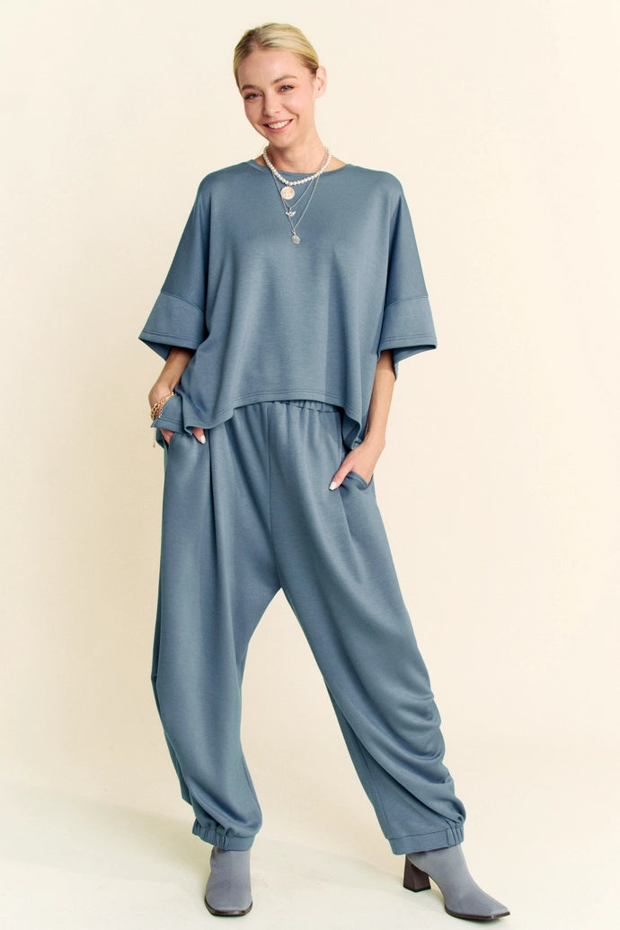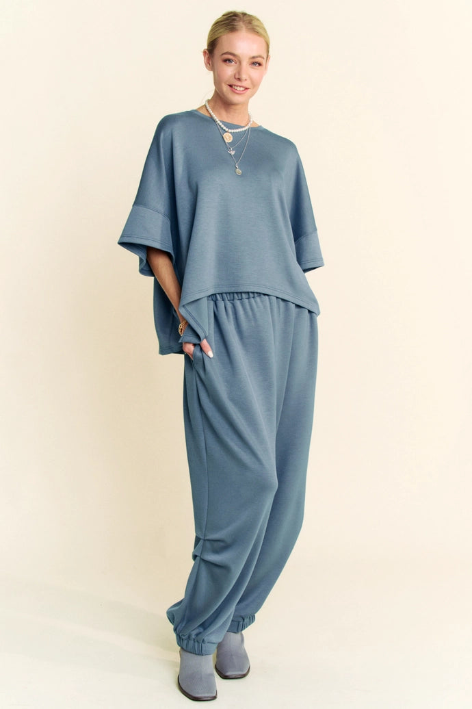 Effortless comfort meets laid-back style with this dreamy two-piece set. The oversized top features a relaxed round neckline and dropped shoulders for that coveted slouchy silhouette, while the flowing fabric drapes beautifully. Pair it with the coordinating pants, complete with an elastic waist and banded hem for a polished finish. Perfect for lounging, running errands, or making casual chic look ridiculously easy.