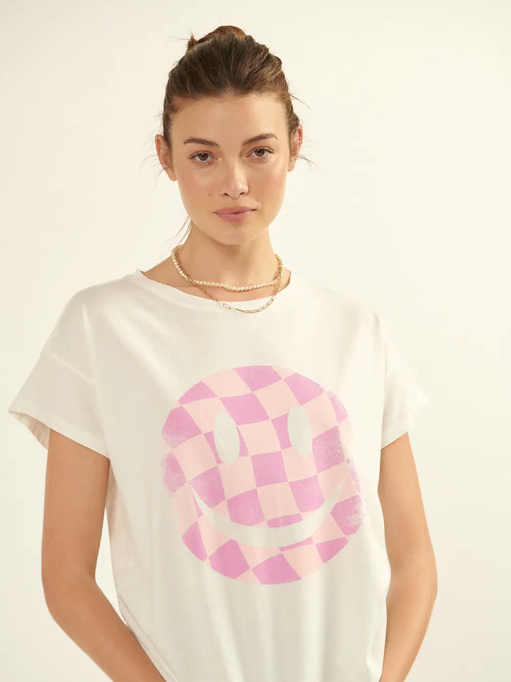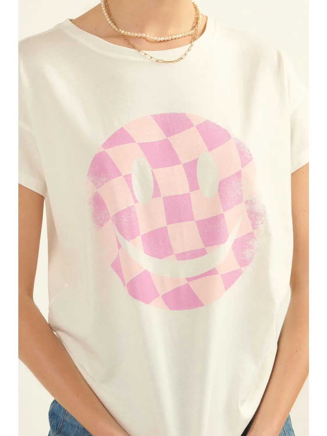 Bring a cheerful vibe to your wardrobe with the Smiley Face Checkered Tee. Featuring a fun smiley face graphic, a comfy round neckline, and a relaxed fit, this tee is perfect for laid-back days and easygoing style. Its playful design adds a touch of joy to any outfit.